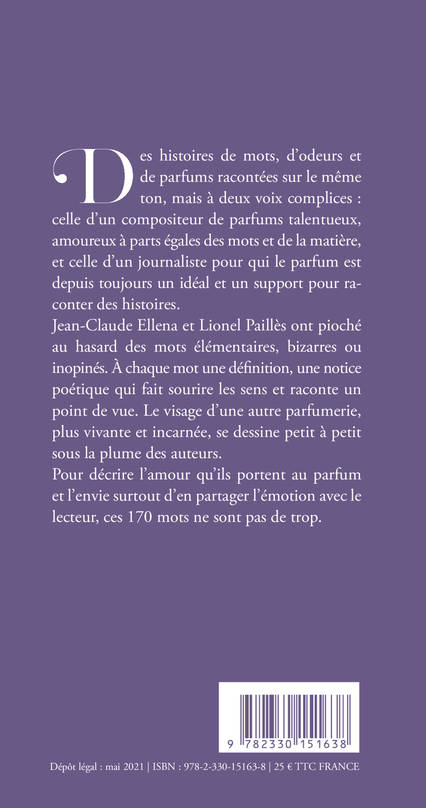 Des histoires de mots, d'odeurs et de parfums racontées sur le même ton, mais à deux voix complices : celle d'un compositeur de parfums talentueux, amoureux à parts égales des mots et de la matière, et celle d'un journaliste pour qui le parfum est depuis toujours un idéal et un support pour raconter des histoires. Jean-Claude Ellena et Lionel Paillès ont pioché au hasard des mots élémentaires, bizarres ou inopinés. À chaque mot une définition, une notice poétique qui fait sourire les sens et raconte un point de vue. Le visage d'une autre parfumerie, plus vivante et incarnée, se dessine petit à petit sous la plume des auteurs. Pour décrire l'amour qu'ils portent au parfum et l'envie surtout d'en partager l'émotion avec le lecteur, ces 170 mots ne sont pas de trop.