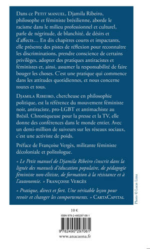 Dans ce Petit manuel, Djamila Ribeiro, philosophe et féministe brésilienne, aborde le racisme dans le milieu professionnel et culturel, parle de négritude, de blanchité, de désirs et affects. En dix chapitres courts et impactants, elle présente des pistes de réflexion pour reconnaître les discriminations, prendre conscience de certains privilèges, adopter des pratiques antiracistes et féministes et, ainsi, assumer la responsabilité de faire bouger les choses. C'est une pratique qui commence dans les attitudes quotidiennes, et nous concerne toutes et tous. Djamila Ribeiro, chercheuse en philosophie politique, est la référence du mouvement féministe noir, antiraciste, pro-LGBT et antimachiste au Brésil. Chroniqueuse pour la presse et la TV, elle donne des conférences dans le monde entier. Avec un demi-million de suiveurs sur les réseaux sociaux, c'est une activiste de poids.Préface de Françoise Vergès, militante féministe décoloniale et politologue. Pratique, direct et fort.