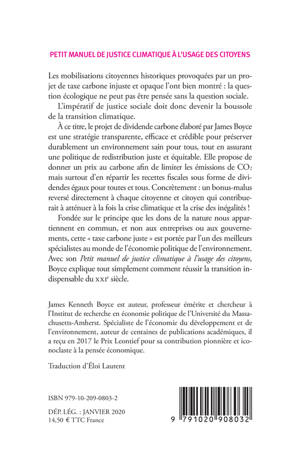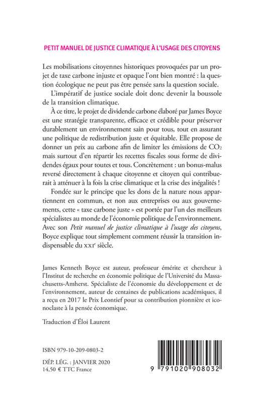 Fondée sur le principe que les dons de la nature nous appartiennent en commun, et non aux entreprises ou aux gouvernements, cette « taxe carbone juste » est portée par l'un des meilleurs spécialistes au monde de l'économie politique de l'environnement. Avec son «Petit manuel de justice climatique à l'usage des citoyens», Boyce explique tout simplement comment réussir la transition indispensable du xxie siècle.