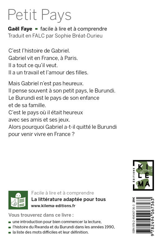 UN LIVRE FACILE À LIRE ET À COMPRENDREC’est l’histoire de Gabriel. Gabriel vit en France, à Paris. Il a tout ce qu’il veut. Il a un travail et l’amour des filles. Mais Gabriel n’est pas heureux. Il pense souvent à son petit pays, le Burundi. Le Burundi est le pays de son enfance et de sa famille.C’est le pays où il était heureux avec ses amis et ses jeux. Alors pourquoi Gabriel a-t-il quitté le Burundi pour la France ?