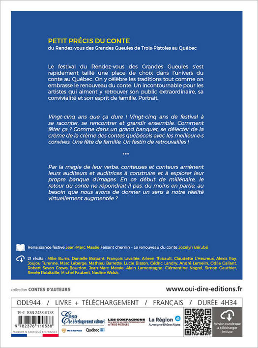 Le festival du Rendez-vous des Grandes Gueules s'est rapidement taillé une place de choix dans l'univers du conte au Québec. On y célèbre les traditions tout comme on embrasse le renouveau du conte. Un incontournable pour les artistes qui aiment y retrouver son public extraordinaire, sa convivialité et son esprit de famille. Portrait. Vingt-cinq ans que ça dure ! Vingt-cinq ans de festival à se raconter, se rencontrer et grandir ensemble. Comment fêter ça ? Comme dans un grand banquet, se délecter de la crème de la crème des contes québécois avec les meilleures convives. Une fête de famille. Un festin de retrouvailles ! * * * Par la magie de leur verbe, conteuses et conteurs amènent leurs auditeurs et auditrices à construire et à explorer leur propre banque d'images. En ce début de millénaire, le retour du conte ne répondrait-il pas, du moins en partie, au besoin que nous avons de donner un sens à notre réalité virtuellement augmentée ?