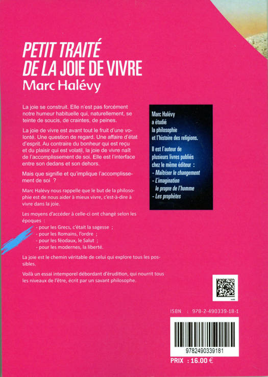 La joie se construit. Elle n’est pas forcément notre humeur habituelle qui, naturellement, se teinte de soucis, de craintes, de peines. La joie de vivre est avant tout le fruit d’une volonté. Une question de regard. Une affaire d’état d’esprit. Au contraire du bonheur qui est reçu et du plaisir qui est volatil, la joie de vivre naît de l’accomplissement de soi. Elle est l’interface entre son dedans et son dehors. Mais que signifie et qu’implique l’accomplissement de soi ? Marc Halévy nous rappelle que le but de la philosophie est de nous aider à mieux vivre, c'est-à-dire à vivre dans la joie. Les moyens d'accéder à celle-ci ont changé selon les époques : pour les Grecs, c'était la sagesse ; pour les Romains, l'ordre ; pour les féodaux, le Salut ; pour les modernes, la liberté. La joie est le chemin véritable de celui qui explore tous les possibles. Voilà un essai intemporel débordant d'érudition, qui nourrit tous les niveaux de l'être, écrit par un savant philosophe.