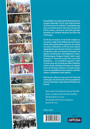 En parallèle à sa magistrale Histoire de France, Jacques Bainville a écrit une Petite histoire de France pour les enfants. Il souhaitait que ceux-ci connaissent le nom des rois qui ont fait la France, comme le récit des grandes batailles où s´étaient illustrés les héros de notre pays. Au fil de la lecture, le récit des origines à nos jours surgit et les références qui constituent notre patrimoine commun, le fil de notre destin, apparaissent aux jeunes lecteurs. Le passé se déroule, telle une immense fresque. Les règnes s´enchaînent. Vercingétorix, Clovis, Charlemagne, Saint Louis, François Ier, Henri IV, Louis XIV, Napoléon... se succèdent jusqu´en 1920. La suite est racontée par Marc Geoffroy, auteur d´une centaine de textes de CD pour enfants. Texte original et intégral de Jacques Bainville - Textes complémentaires de Marc Geoffroy - Présentation de 45 rois et empereurs - Avec 360 illustrations - 33 textes complémentaires sur la vie quotidienne des Français enrichissent cette édition