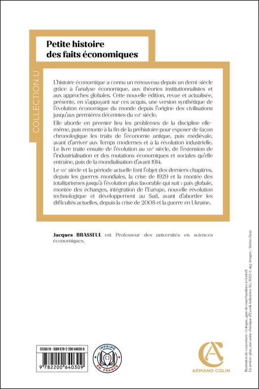 L’histoire économique a connu un renouveau depuis un demi-siècle grâce à l’analyse économique, aux théories institutionnalistes et aux approches globales. Cette nouvelle édition, revue et actualisée, présente, en s’appuyant sur ces acquis, une version synthétique de l’évolution économique du monde depuis l’origine des civilisations jusqu’aux premières décennies du XXIe siècle. Elle aborde en premier lieu les problèmes de la discipline elle-même, puis remonte à la fin de la préhistoire pour exposer de façon chronologique les traits de l’économie antique, puis médiévale, avant d’arriver aux Temps modernes et à la révolution industrielle. Le livre insiste ensuite sur l’évolution au XIXe siècle, l’extension de l’industrialisation et les mutations économiques et sociales qu’elle entraîne, puis la mondialisation d’avant 1914. Le XXe siècle et la période actuelle font l’objet des derniers chapitres, depuis les guerres mondiales, la crise de 1929 et la montée des totalitarismes jusqu’à l’évolution plus favorable qui suit : paix globale, montée des échanges, intégration de l’Europe, nouvelle révolution technologique et développement au Sud, avant d’aborder les difficultés actuelles, depuis la crise de 2008.