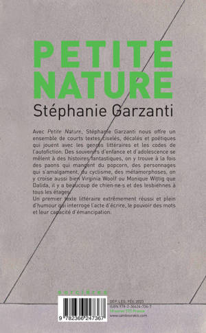 Avec Petite Nature, Stéphanie Garzanti nous offre un ensemble de courts textes ciselés, décalés et poétiques qui jouent avec les genres littéraires et les codes de l'autofiction. Des souvenirs d'enfance et d'adolescence se mêlent à des histoires fantastiques, on y trouve à la fois des paons qui mangent du popcorn, des personnages qui s'amalgament, du cyclisme, des métamorphoses, on y croise aussi bien Virginia Woolf ou Monique Wittig que Dalida, il y a beaucoup de chien·ne·s et des lesbiennes à tous les étages. Un premier texte littéraire extrêmement réussi et plein d'humour qui interroge l'acte d'écrire, le pouvoir des mots et leur capacité d'émancipation.