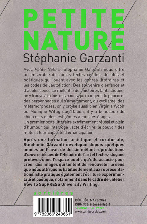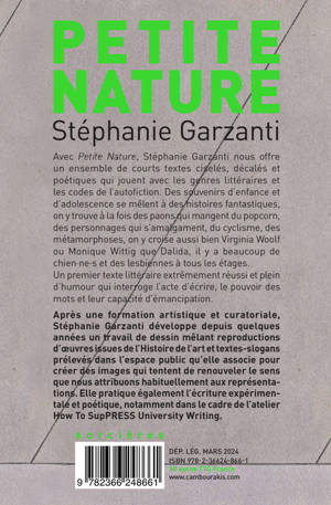 Avec Petite Nature, Stéphanie Garzanti nous offre un ensemble de courts textes ciselés, décalés et poétiques qui jouent avec les genres littéraires et les codes de l'autofiction. Des souvenirs d'enfance et d'adolescence se mêlent à des histoires fantastiques, on y trouve à la fois des paons qui mangent du popcorn, des personnages qui s'amalgament, du cyclisme, des métamorphoses, on y croise aussi bien Virginia Woolf ou Monique Wittig que Dalida, il y a beaucoup de chien·ne·s et des lesbiennes à tous les étages.