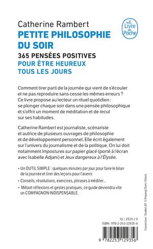 Quel bilan tirer de la journée qui vient de s’écouler ? A-t-elle été aussi bonne qu’on le pensait ? Comment ne plus répéter le lendemain les erreurs du jour ? A-t-on mis tous les atouts de son côté pour atteindre ses objectifs ? Ce livre rassemble des petites stratégies à méditer au terme de la journée afin de passer en revue nos actes, et d’en tirer des leçons pour l’avenir. Quel meilleur moment que le soir pour réfléchir, faire le point sur les heures qui viennent de s’écouler et prendre de bonnes résolutions pour les jours suivants ? Conseils, exercices pratiques, voici 365 pensées à mettre en application chaque soir pour une existence plus sereine et plus épanouie.