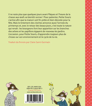 Il ne reste plus que quelques jours avant Pâques et l'heure de la chasse aux oeufs va bientôt sonner ! Pour patienter, Petite Souris s'active afin que la maison soit fin prête et bien décorée pour la fête. Mais le tintement des cloches annonce aussi l'arrivée du printemps et, avec le retour des beaux jours, c'est toute la nature qui renaît : les bourgeons font leur apparition sur les branches des arbres et les papillons égayent de nouveau les jardins. L'occasion, pour Petite Souris, d'apprendre toujours plus de choses sur son environnement et le cycle de la vie.