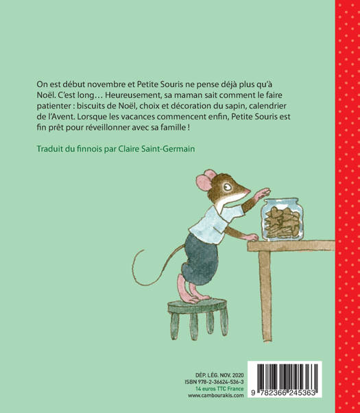 Après «Petite Souris n'en fait qu'à sa tête» et «Petite Souris a un invité», un album de Noël dans lequel Petite Souris a du mal à contenir son impatience à l'approche du 25 décembre. Heureusement, sa maman redouble d'inventivité pour l'occuper. Un album festif, empreint de l'esprit de Noël, qui pointe aussi le nécessaire apprentissage de la patience.