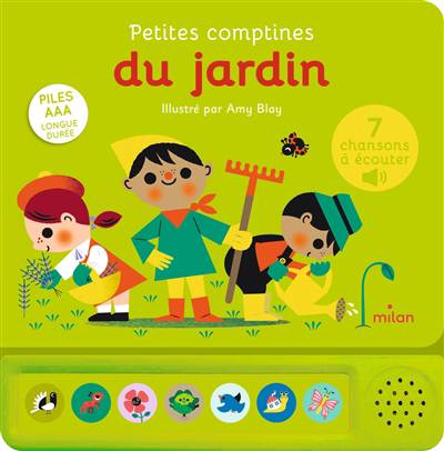 Sept comptines sur le thème du jardin à écouter grâce à des puces sonores : Y a une pie, La fourmi m'a piqué la main, Gentil coquelicot, Savez-vous planter les choux ?, A la volette, Petit escargot et Vole, vole, papillon.