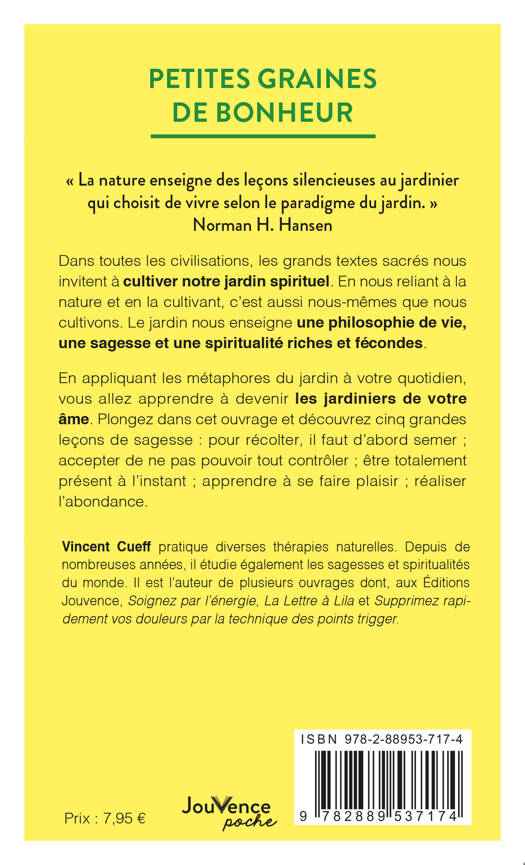 En appliquant les métaphores du jardin à votre quotidien, vous allez apprendre à devenir les jardiniers de votre âme. Plongez dans cet ouvrage et découvrez cinq grandes leçons de sagesse : pour récolter, il faut d’abord semer ; accepter de ne pas pouvoir tout contrôler ; être totalement présent à l’instant ; apprendre à se faire plaisir ; réaliser l’abondance.