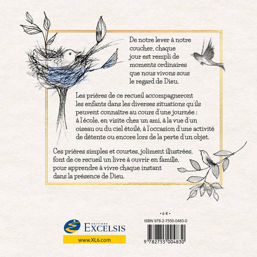 De notre lever à notre coucher, chaque jour est rempli de moments ordinaires que nous vivons sous le regard de Dieu. Les prières de ce recueil accompagneront les enfants dans les diverses situations qu’ils peuvent connaître au cours d’une journée : à l’école, en visite chez un ami, à la vue d’un oiseau ou du ciel étoilé, à l’occasion d’une activité de détente ou encore lors de la perte d’un objet. Ces prières simples et courtes, joliment illustrées, font de ce recueil un livre à ouvrir en famille, pour apprendre à vivre chaque instant dans la présence de Dieu.