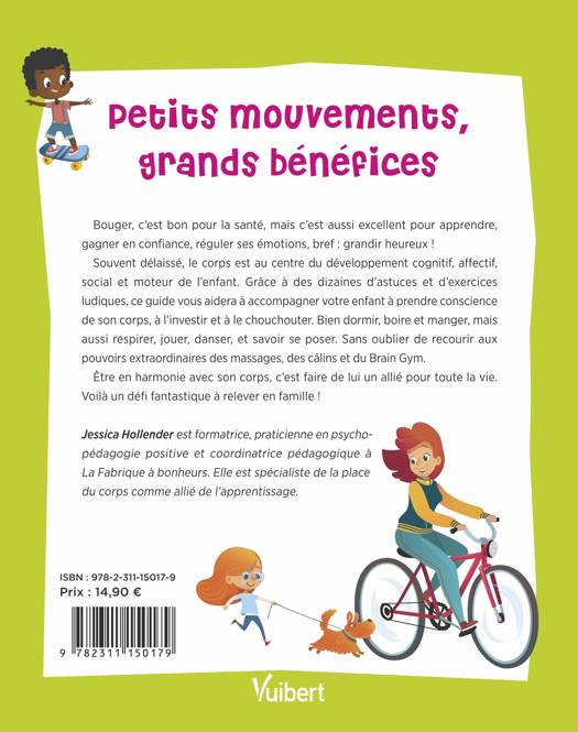 Souvent délaissé, le corps est au centre du développement cognitif, affectif, social et moteur de l’enfant. Grâce à des dizaines d’astuces et d’exercices ludiques, ce guide vous aidera à accompagner votre enfant à prendre conscience de son corps, à l’investir et à le chouchouter. Bien dormir, boire et manger, mais aussi respirer, jouer, danser, et savoir se poser. Sans oublier de recourir aux pouvoirs extraordinaires des massages, des câlins et du Brain Gym.