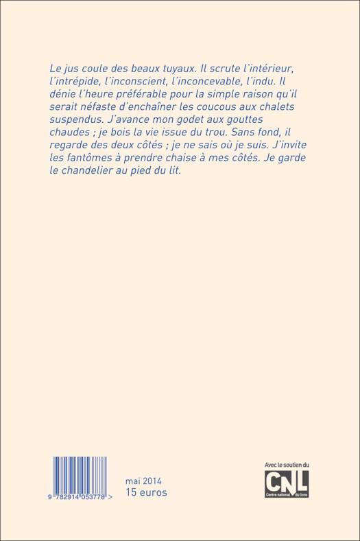 Extrait « Enfantine aguerrie n° 2 (sur Gnossienne n° 2) Le jus coule des beaux tuyaux. Il scrute l’intérieur, l’intrépide, l’inconscient, l’inconcevable, l’indu. Il dénie l’heure préférable pour la simple raison qu’il serait néfaste d’enchaîner les coucous aux chalets suspendus. J’avance mon godet aux gouttes chaudes ; je bois la vie issue du trou. Sans fond, il regarde des deux côtés ; je ne sais où je suis. J’invite les fantômes à prendre chaise à mes côtés. Je garde le chandelier au pied du lit. »
