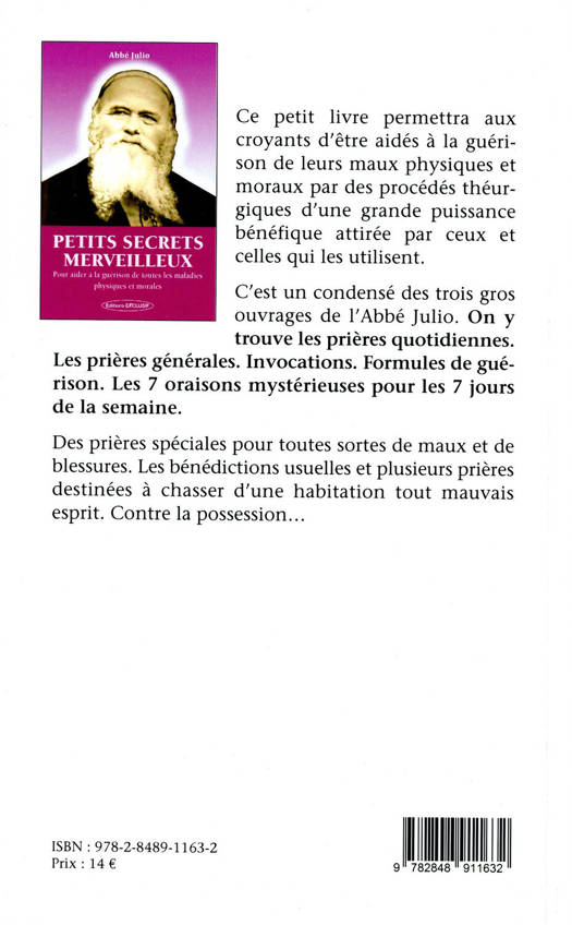 Ce petit livre permettra aux croyants d'être aidés à la guérison de leurs maux physiques et moraux par des procédés théurgiques d'une grande puissance bénéfique attirée par ceux et celles qui les utilisent. C'est un condensé des trois gros ouvrages de l'Abbé Julio. On y trouve les prières quotidiennes. Les prières générales. Invocations. Formules de guérison. Les 7 oraisons mystérieuses pour les 7 jours de la semaine. Des prières spéciales pour toutes sortes de maux et de blessures. Les bénédictions usuelles et plusieurs prières destinées à chasser d'une habitation tout mauvais esprit. Contre la possession...