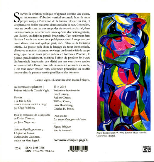 Ce sixième numéro de Peut-être s’ouvre avec le souvenir de Daniel Vigée, qui s’est éteint au début du mois de novembre 2013. Il aurait eu soixante et un an à la fin de novembre 2014. Tous ceux qui ont côtoyé Daniel, tous ceux qui l’ont connu à travers les poèmes de Claude Vigée, partagent une grande tristesse et s’associent pleinement au deuil de sa famille, et tout particulièrement de son épouse Jola et de ses enfants, Nathalie (et son époux) et Raphaël. Nous reproduisons la brève allocution que Claude avait dictée à Nathalie pour la cérémonie de Bischwiller ainsi que le discours de Claude Heymann, Rabbin de la communauté de Haguenau. Nous associons Evy à son fils dans notre souvenir. Les essais de Claude Vigée ici repris, partiellement pour « L’annonce d’un matin d’hiver », et dans son intégralité pour « Esclaves et étrangers : Flaubert et Chateaubriand à Jérusalem », permettent de bien mettre en relief la complémentarité de ces lieux, l’Alsace et Jérusalem, dans l’existence et dans l’oeuvre de Claude ainsi que dans la vie de sa famille. Blandine Chapuis dédie à Evy son étude fouillée, très sensible et pertinente, sur l’oeuvre de Claude Vigée : « La poésie comme promesse d’avenir ». Il est aussi beaucoup question de cette oeuvre qui nous rassemble dans le dossier qu’Oleg Poliakow a réuni pour nous autour d’une réflexion sur le verset de la Genèse concernant la création de l’homme (Genèse 2, 7) associée à cette belle expression du philosophe Paul Ricoeur : « L’homme, c’est la Joie du Oui dans la tristesse du fini. » Nous traversons une période de commémorations multiples. L’année 2014 marquait le centenaire de la naissance de Dylan Thomas, que célèbre Jean Migrenne, mais inaugurait également une double perspective historique, le centenaire du début de la Grande Guerre s’associant avec le soixante-dixième anniversaire de la Libération. Nelly Carnet s’est entretenue avec Nelly Leviandier-Coulon, résistante. Je poursuis mon travail de réflexion sur les poètes de la Grande Guerre. Pierre Brunel nous parle de Rimbaud et établit un lien particulier avec l’oeuvre de Claude Vigée. Le cahier de création s’ouvre avec des poèmes inédits de Claude. Marc Sagnol nous initie par ses traductions à l’oeuvre d’Alexandre Guelman, poète russe, et d’Inna Fridkina. Je propose, en version bilingue, des poèmes très célèbres de Wilfred Owen, Charles Hamilton Sorley, Isaac Rosenberg, Ivor Gurney et Robert Graves. On retrouvera ensuite, ou on découvrira, Gabrielle Althen, Beryl Cathelineau-Villatte, Marc Kauffmann, Pénélope Sacks-Galey et Marc Sagnol. Jean-Luc Hohl-Muller nous donne à lire un essai sur la langue alsacienne, sous forme de nouvelle, « Les écureuils ». Lydie et Guy Baranton, fille et fils du peintre dont nous présentons l’oeuvre, Roger Baranton, évoquent pour nous leur père et sa joie de peindre, qui transcenda pour lui toute autre difficulté d’existence. Il se situe dans cette école de Paris d’après la Seconde Guerre mondiale.