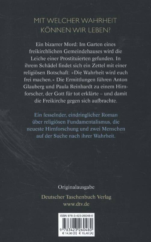 Ein bizarrer Mord: Im Garten eines freikirchlichen Gemeindehauses wird die Leiche einer Prostituierten gefunden. In ihrem Schädel findet sich ein Zettel mit einer religiösen Botschaft: »Die Wahrheit wird euch frei machen.« Als der Kriminalbeamte Anton Glauberg vom Tatort nach Hause kommt, sitzt überraschendseine ehemalige Kollegin Paula Reinhardt vor der Tür. Reinhardt war vor Jahren selbst wegen Mordes verurteilt worden - jetzt ist sie auf Bewährung wieder frei. Glauberg nimmt Paula mit auf seine Ermittlungen, die ihn bald zu einem Forscher am Max-Planck-Institut für Neurobiologie führen.Dieser hatte aus wissenschaftlicher Perspektive Gott für tot erklärt - und damit die Vertreter der Freikirche gegen sich aufgebracht.