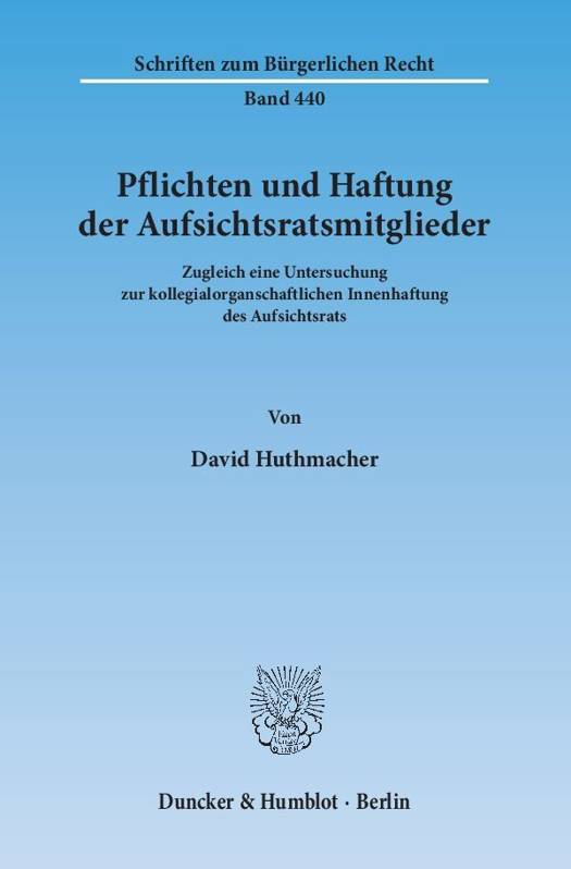 Sodann widmet sich der Autor der Frage, welche Folgen die Verletzungen der vorgenannten Pflichten haftungsrechtlich nach sich ziehen. Dabei geht er in einem ersten Teil auf die Haftung der einzelnen Mitglieder gegenüber dem Organ ein, bevor in einem weiteren Schritt geprüft wird, ob nicht vielmehr eine primäre Haftung des Organs Aufsichtsrat gegenüber der Gesellschaft und eine Haftungsüberleitung auf die einzelnen Mitglieder stattfindet. Ausgehend von dieser Frage untersucht David Huthmacher insbesondere die historische Entstehung der Aufsichtsratshaftung und arbeitet hieran die Bedeutung und Intention der jeweiligen Gesetzgeber heraus. Die Arbeit schließt mit der Untersuchung von weiteren Mitteln zur Stärkung der Überwachung de lege ferenda.