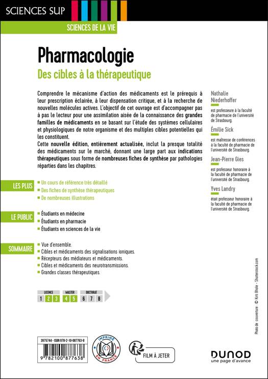 Comprendre le mécanisme d’action des médicaments est le prérequis à leur prescription éclairée, à leur dispensation critique, et à la recherche de nouvelles molécules actives. Cette compréhension est l’objectif de cet ouvrage qui a, dès sa première édition, totalement renouvelé l’approche pédagogique de la pharmacologie. Il s’adresse aux étudiants en médecine, pharmacie et sciences de la vie, mais aussi à tous les professionnels de santé qui y trouveront les connaissances et les concepts les plus récents. Pour être efficace le médicament utilise les systèmes cellulaires et physiologiques de notre organisme et les multiples cibles potentielles qui les constituent. C’est sur la base de ces systèmes et fonctions cellulaires et physiologiques que les auteurs emmènent pas à pas le lecteur pour une assimilation aisée de la connaissance des grandes familles de médicaments. Cette nouvelle édition, réactualisée, inclut la presque totalité des médicaments sur le marché, donnant une large part aux indications thérapeutiques sous forme de nombreuses fiches de synthèse par pathologies réparties dans les chapitres.