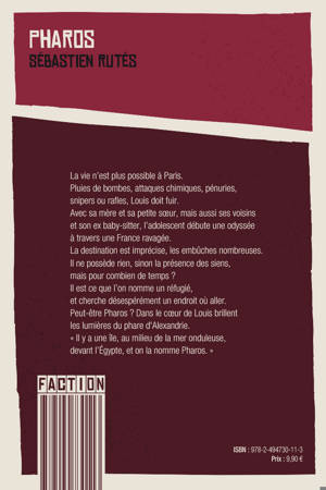 La vie n'est plus possible à Paris. Pluies de bombes, attaques chimiques, pénuries, snipers ou rafles, Louis doit fuir. Avec sa mère et sa petite soeur, mais aussi ses voisins et son ex baby-sitter, l'adolescent débute une odyssée à travers une France ravagée. La destination est imprécise, les embûches nombreuses. Il ne possède rien, sinon la présence des siens, mais pour combien de temps ? Il est ce que l'on nomme un réfugié, et cherche désespérément un endroit où aller. Peut-être Pharos ? Dans le coeur de Louis brillent les lumières du phare d'Alexandrie. « Il y a une île, au milieu de la mer onduleuse, devant l'Égypte, et on la nomme Pharos. »