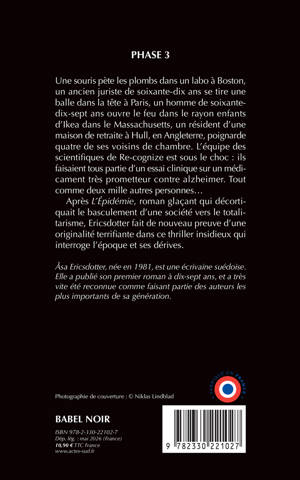 Une souris pète les plombs dans un labo à Boston, un ancien juriste de soixante-dix ans se tire une balle dans la tête à Paris, un homme de soixante-dix-sept ans ouvre le feu dans le rayon enfants d'Ikea dans le Massachusetts, un résident d'une maison de retraite à Hull, en Angleterre, poignarde quatre de ses voisins de chambre. L'équipe des scientifiques de Re-cognize est sous le choc : ils faisaient tous partie d'un essai clinique sur un médicament très prometteur contre alzheimer. Tout comme deux mille autres personnes... Après L'Épidémie, roman glaçant qui décortiquait le basculement d'une société vers le totalitarisme, Ericsdotter fait de nouveau preuve d'une originalité terrifiante dans ce thriller insidieux qui interroge l'époque et ses dérives.
