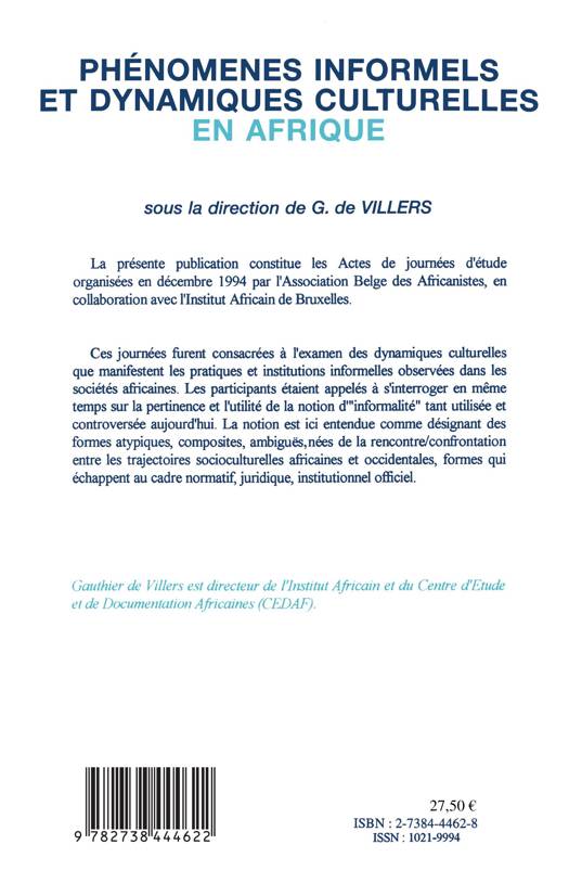 La présente publication constitue les Actes de journées d'étude organisées en décembre 1994 par l'Association Belge des Africanistes, en collaboration avec l'Institut Africain de Bruxelles.. Ces journées furent consacrées à l'examen des dynamiques culturelles que manifestent les pratiques et institutions informelles observées dans les sociétés africaines. Les participants étaient appelés à s'interroger en même temps sur la pertinence et l'utilité de la notion d'"informalité" tant utilisée et controversée aujourd'hui. La notion est ici entendue comme désignant des formes atypiques, composites, ambiguës, nées de la rencontre/confrontation entre les trajectoires socioculturelles africaines et occidentales, formes qui échappent au cadre normatif, juridique, institutionnel officiel...