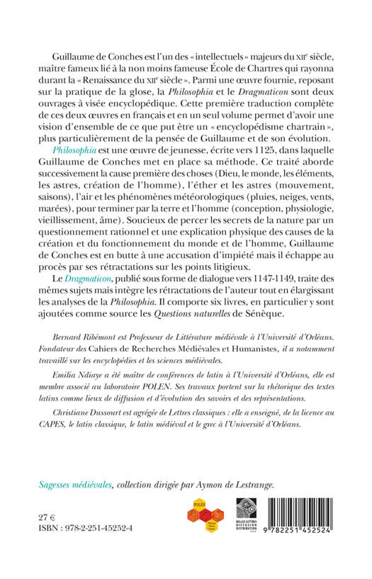 Guillaume de Conches est l'un des intellectuels majeurs du XIIe siecle, maitre fameux lie a la non moins fameuse Ecole de Chartres qui rayonna durant la Renaissance du XIIe siecle. Parmi une oeuvre fournie, reposant sur la pratique de la glose, la Philosophia et le Dragmaticon sont deux ouvrages a visee encyclopedique. Cette premiere traduction complete de ces deux oeuvres en francais et en un seul volume permet d'avoir une vision d'ensemble de ce que put etre un encyclopedisme chartrain, plus particulierement de la pensee de Guillaume et de son evolution. Philosophia est une oeuvre de jeunesse, ecrite vers 1125, dans laquelle Guillaume de Conches met en place sa methode. Ce traite aborde successivement la cause premiere des choses (Dieu, le monde, les elements, les astres, creation de l'homme), l'ether et les astres (mouvement, saisons), l'air et les phenomenes meteorologiques (pluies, neiges, vents, marees), pour terminer par la terre et l'homme (conception, physiologie, vieillissement, ame). Soucieux de percer les secrets de la nature par un questionnement rationnel et une explication physique des causes de la creation et du fonctionnement du monde et de l'homme, Guillaume de Conches est en butte a une accusation d'impiete mais il echappe au proces par ses retractations sur les points litigieux. Le Dragmaticon, publie sous forme de dialogue vers 1147-1149, traite des memes sujets mais integre les retractations de l'auteur tout en elargissant les analyses de la Philosophia. Il comporte six livres, en particulier y sont ajoutees comme source les Questions naturelles de Seneque.