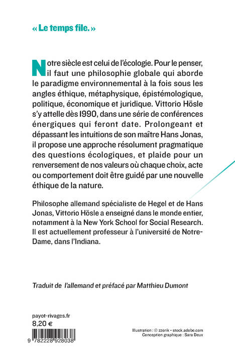 Notre siècle est celui de l'écologie. Pour le penser, il faut une philosophie globale qui aborde le paradigme environnemental à la fois sous les angles éthique, métaphysique, épistémologique, politique, économique et juridique. Parallèlement aux travaux américains, un jeune prodige allemand, Vittorio Hösle, proposait de s'y atteler dès 1990, dans une série de conférences énergiques qui firent date. Prolongeant et dépassant les intuitions de son maître Hans Jonas, il a fait avec ce livre clair et imagé une entrée spectaculaire dans l'histoire de la pensée.