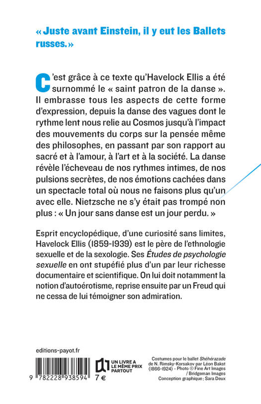 « Juste avant Einstein, il y eut les Ballets russes. » C'est grâce à ce texte qu'Havelock Ellis a été surnommé le « saint patron de la danse ». Il embrasse tous les aspects de cette forme d'expression, depuis la danse des vagues dont le rythme lent nous relie au Cosmos jusqu'à l'impact des mouvements du corps sur la pensée même des philosophes, en passant par son rapport au sacré et à l'amour, à l'art et à la société. La danse révèle l'écheveau de nos rythmes intimes, de nos pulsions secrètes, de nos émotions cachées dans un spectacle total où nous ne faisons plus qu'un avec elle. Nietzsche ne s'y était pas trompé non plus : « Un jour sans danse est un jour perdu. »