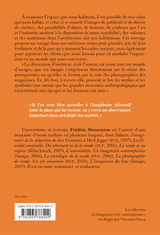 À examiner l’espace que nous habitons, il est possible de voir celui qui nous habite, et celui-ci se nourrit d’images de publicité et de décors de cinéma , des possibilités d’objets, de formats, de couleurs que l’art et l’industrie mettent à la disposition de notre sensibilité , des volumes et des matériaux dont l’architecture fait nos habitations. Cet ouvrage propose un voyage dans nos intérieurs certes pour prendre acte de leur évolution et de la part qu’y tiennent les cadres sociaux, mais également pour apprécier les efforts que nous faisons pour en moduler l’expression en un monde qui nous convienne.