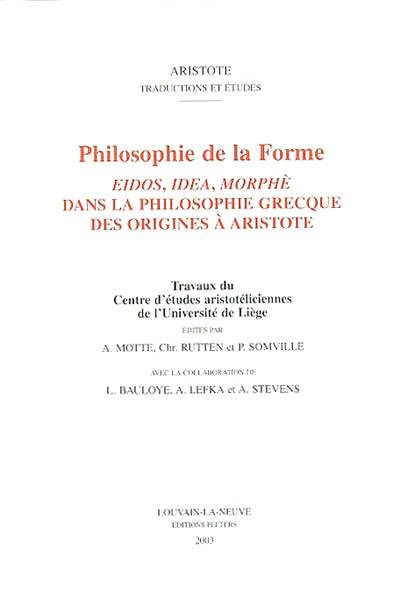 Toutes les occurences des trois termes presentes dans les fragments des philosophes presocratiques ainsi que dans les oeuvres de Platon et d'Aristote ont ete examinees par une quinzaine de professeurs et de chercheurs issus des Universites de Liege, de Bruxelles, de Louvain-la-Neuve et de Leuven. Les resultats de l'enquete ont ete presentes et discutes au cours d'un colloque qui s'est tenu a Liege en mars 2001. Dans le volume, chacun des trois corpus donne lieu en outre a un tableau recapitulatif des occurences et a des conclusions propres. Un quatrieme chapitre comprend une etude sur Proclus ainsi que des investigations relatives aux traductions arabes et latines du vocabulaire concerne. Pour finir, Enrico Berti degage les principaux resultats du travail et montre aussi certains enjeux de cette philosophie de la forme inauguree par les penseurs grecs. L'ouvrage comprend une bibliographie de quelque deux cents quarante titres ainsi qu'un index des mots semantiquement apparentes aux trois termes etudies et des autres mots qui apparaissent frequemment dans leur voisinage.