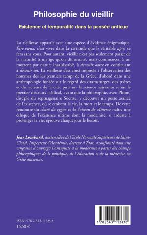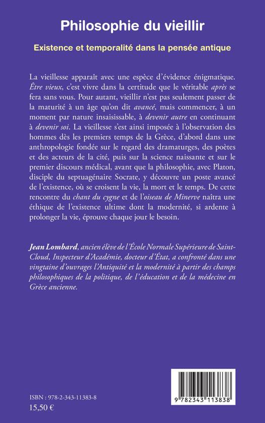 La vieillesse s'est imposée avec une sorte d'évidence énigmatique à l'observation des hommes dès les premiers temps de la Grèce, d'abord dans une anthropologie enrichie par la science naissante et le premier discours médical, avant que la philosophie y découvre une sorte de poste avancé de l'existence, où se croisent la vie, la mort et le temps. De cette rencontre du chant du cygne et de l'oiseau de Minerve naîtra, avec le stoïcisme romain, une éthique de l'existence ultime.