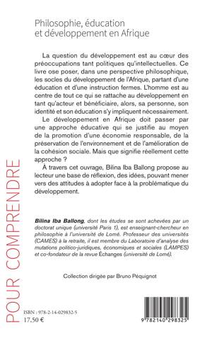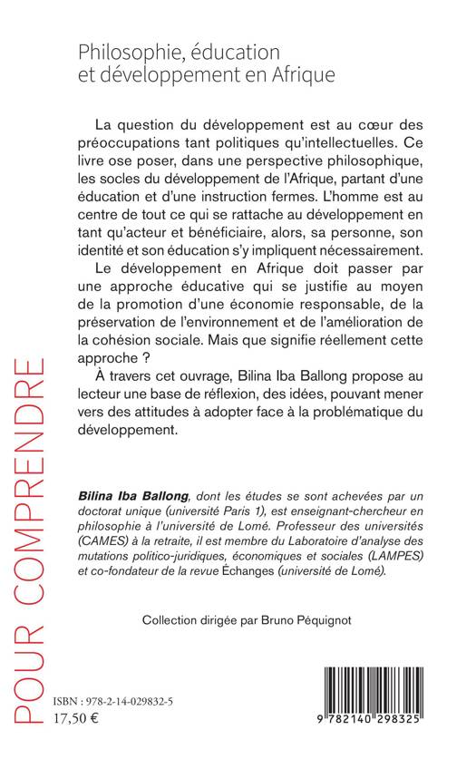 La question du développement est au coeur des préoccupations tant politiques qu'intellectuelles. Ce livre ose poser, dans une perspective philosophique, les socles du développement de l'Afrique, partant d'une éducation et d'une instruction fermes. L'homme est au centre de tout ce qui se rattache au développement en tant qu'acteur et bénéficiaire, alors, sa personne, son identité et son éducation s'y impliquent nécessairement. Le développement en Afrique doit passer par une approche éducative qui se justifie au moyen de la promotion d'une économie responsable, de la préservation de l'environnement et de l'amélioration de la cohésion sociale. Mais que signifie réellement cette approche ? À travers cet ouvrage, Bilina Iba Ballong propose au lecteur une base de réflexion, des idées, pouvant mener vers des attitudes à adopter face à la problématique du développement.