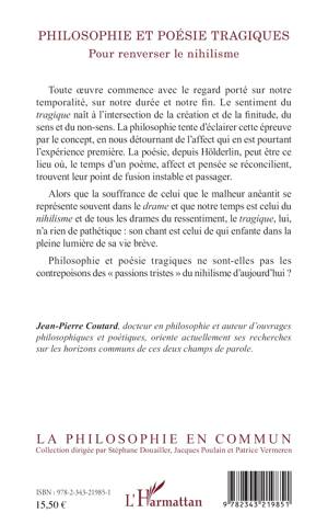 Toute oeuvre commence avec le regard porté sur notre temporalité, notre durée et notre fin. Le sentiment du tragique naît à l'intersection de la création et de la finitude, du sens et du non-sens. La philosophie tente d'éclairer cette épreuve par le concept, en nous détournant de l'affect qui en est pourtant l'expérience première. La poésie, depuis Hölderlin, peut être ce lieu où affect et pensée se réconcilient, trouvent leur point de fusion instable et passager. Alors que la souffrance se représente souvent dans le drame et que notre temps est celui du nihilisme et de tous les drames du ressentiment, le tragique, lui, n'a rien de pathétique : son chant est celui de qui enfante dans la pleine lumière de sa vie brève. Philosophie et poésie tragiques ne sont-elles pas les contrepoisons des « passions tristes » du nihilisme d'aujourd'hui ?