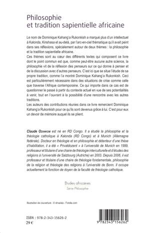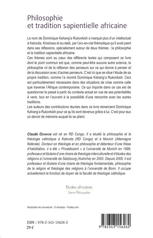 Le nom de Dominique Kahang'a Rukonkish a marqué plus d'un intellectuel à Kalonda, Kinshasa et au-delà, par l'arc-en-ciel thématique qu'il avait peint dans ses réflexions, spécialement autour de deux thèmes : la philosophie et la tradition sapientielle africaine. Ces thèmes sont au coeur des différents textes qui composent ce livre dont le point commun est que, comme peut-être aucune autre science, la philosophie vit de la réflexion des penseurs sur ce qui donne à penser et de la discussion avec d'autres penseurs. C'est ici que se situe l'étude de sa propre tradition, comme l'a montré Dominique Kahang'a Rukonkish.