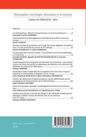 Au sommaire : La radicalisation : désir de reconnaissance ou de transcendance ? de Romuald Évariste BAMBARA ; Communication de développement chez Marcuse et défis sociaux en Afrique de Amara SALIFOU ; Normes sociales de production et d'usage des huiles végétales au Burkina Faso. Cas des provinces du Sourou et du Yatenga de Karim OUEDRAOGO et Gabin KORBEOGO ; Conservation des souvenirs festifs : la transition vers le tout numérique au Cameroun de Ismaïla DATIDJO, Ayouba NCHOUTPOUENDIGNIGNI et Armand TCHINENBA ; La gouvernance de la recherche en éducation au Cameroun : une analyse à partir de l'écart des profils académiques des directeurs de mémoire des étudiants en sciences de l'éducation de Mama CHANDINI ; Dynamique spatio-temporelle de l'occupation des terres dans l'espace supérieur et universitaire à Butembo en R.D. Congo de Isaac Muhindo KIVIKYAVO et Blaise Mumbere MALIKIDOGO ; Gestion des démarches d'apprentissage en classes pléthoriques par les enseignants de l'école primaire de la ville de Kindu de Roger NGONGO MEDARD ; Zones économiques spéciales et développement territorial du Burkina Faso de Jean Rabaswendé OUEDRAOGO et Taladi Narcisse YONLI ; Analyse économique et fiscale des dîmes et des offrandes versées par les ménages à faibles revenus de Mwene-Ditu et ses environs en R. D. Congo de Anastas KAZADI MATANDA