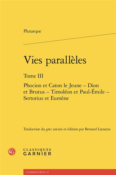 Au IIe siècle de notre ère, Plutarque renouvelle le genre très apprécié de la biographie pour en faire un jeu de miroirs d'une rive à l'autre de l'Adriatique. En juxtaposant Thésée et Romulus, Alexandre le Grand et César, Démosthène et Cicéron, Alcibiade et Coriolan, il souligne un même destin ou un même caractère. C'est que l'écrivain est convaincu de l'utilité morale de l'histoire. Réservoir inépuisable d'anecdotes et d'exemples édifiants, ces portraits de grands hommes sont touchants par les scènes modestes que Plutarque se plaît aussi à rapporter, comme en contrepoint aux épisodes grandioses dont sont emplis les récits. Jean-Jacques Rousseau sortit profondément bouleversé de la lecture de cette oeuvre aussi vaste que plaisante.
