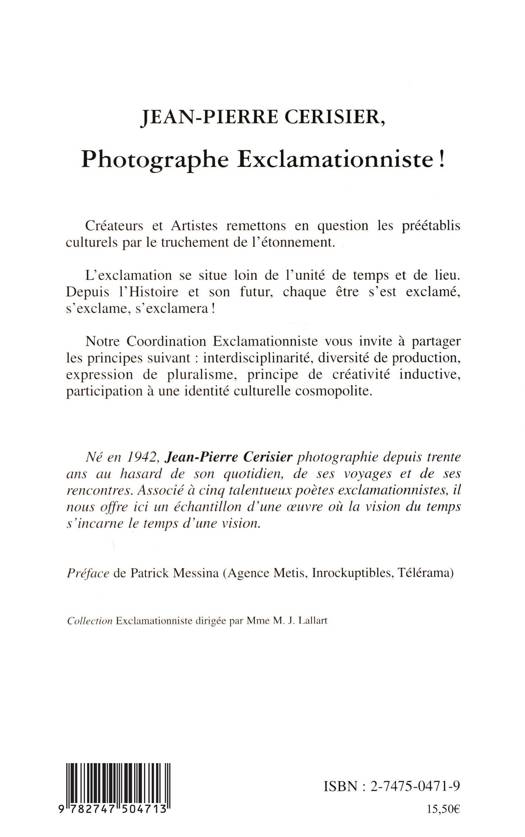 Jean-Pierre Cerisier photographie depuis trente ans au hasard de son quotidien, de ses voyages, de ses rencontres. Associé à cinq talentueux poètes exclamationnistes, il nous offre ici un échantillon d'une œuvre où la vision du temps s'incarne, le temps d'une vision.