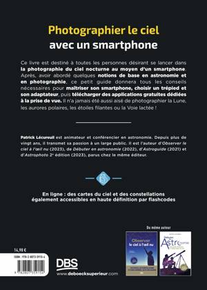 Ce livre est destiné à toutes les personnes désirant se lancer dans la photographie du ciel nocturne au moyen d’un smartphone. Après, avoir abordé quelques notions de base en astronomie et en photographie, ce petit guide donnera tous les conseils nécessaires pour maîtriser son smartphone, choisir un trépied et son adaptateur, puis télécharger des applications gratuites dédiées à la prise de vue. Il n’a jamais été aussi aisé de photographier la Lune, les aurores polaires, les étoiles filantes ou la Voie lactée !
