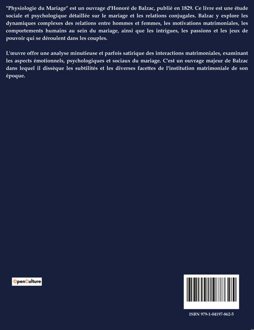 "Physiologie du Mariage" est un ouvrage d'Honoré de Balzac, publié en 1829. Ce livre est une étude sociale et psychologique détaillée sur le mariage et les relations conjugales. Balzac y explore les dynamiques complexes des relations entre hommes et femmes, les motivations matrimoniales, les comportements humains au sein du mariage, ainsi que les intrigues, les passions et les jeux de pouvoir qui se déroulent dans les couples.