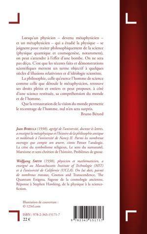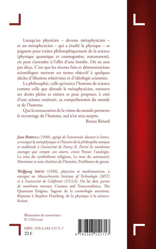 Lorsqu’un physicien et un métaphysicien se joignent pour traiter philosophiquement de la science, on peut s’attendre à l’effet d’une bombe. On ne sera pas déçu. C’est que les récents faits et démonstrations scientifiques mettent un terme objectif à quelques siècles d’illusions relativistes et d’idéologie scientiste. La philosophie, celle qu’exerce l’homme de science comme celle que déroule le métaphysicien, retrouve ses droits pleins et entiers et peut proposer, à côté d’une science restituée, sa compréhension du monde et de l’homme. Que la restauration de la vision du monde permettre le recentrage de l’homme, nul n’en sera surpris. (Bruno Bérard)