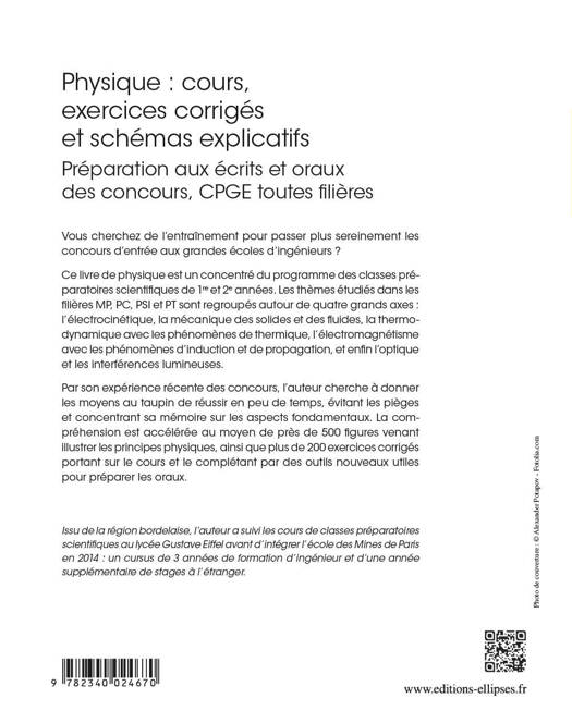 Ce livre de physique est un concentré du programme des classes préparatoires scientifiques de 1re et 2e années. Les thèmes étudiés dans les filières MP, PC, PSI et PT sont regroupés autour de quatre grands axes : l’électrocinétique, la mécanique des solides et des fluides, la thermodynamique avec les phénomènes de thermique, l’électromagnétisme avec les phénomènes d’induction et de propagation, et enfin l’optique et les interférences lumineuses.