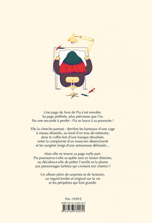 Une page du livre de Pia s’est envolée. Sa page préférée, plus précieuse que l’or. Pas une seconde à perdre : Pia se lance à sa poursuite ! Elle la cherche partout : derrière les barreaux d’une cage à oiseau désertée, au fond d’un trou de mémoire, dans le coffre-fort d’une banque dévalisée, entre la complainte d’un musicien désenchanté et les sanglots longs d’une amoureuse délaissée… Mais elle ne trouve sa page nulle part. Pia poursuivra-t-elle sa quête sans se laisser distraire, ou décidera-t-elle de prêter l’oreille et la plume aux personnages farfelus qui croisent son chemin ? Un album plein de surprises et de fantaisie, un regard tendre et original sur la vie et les péripéties qui font grandir.