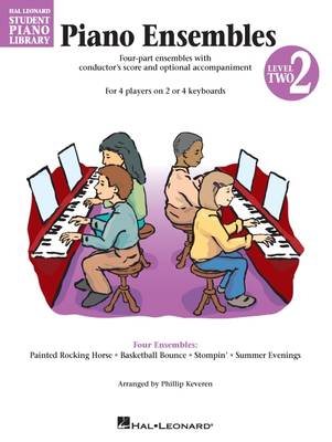 (Educational Piano Library). Four-part student ensembles arranged for two or more pianos. These ensembles, arranged by Phillip Keveren, feature student favorites from Book 2 of the Hal Leonard Student Piano Library. Each book contains four selections which include: * Four student parts * Conductor's score with optional teacher accompaniment * Performance configurations for 2 or more pianos * Suggested instrumentation for electronic keyboards. Fully orchestrated CD and GM accompaniment disks are available separately. Four ensembles: Painted Rocking Horse * Basketball Bounce * Stompin' * Summer Evenings. To see other NFMC selections, click here.