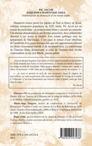 Manuscrit trouvé parmi les papiers de Paul et Henry de Kock, célèbres romanciers populaires du XIXe siècle, Pic Jacob est un roman de confession : un jeune homme blanc y raconte ses remords. Une femme abandonnée et une femme assassinée, deux infanticides donnent à ces aveux la tonalité d’un roman gothique sous les tamariniers de Martinique. C’est aussi le roman d’une rébellion, de l’ambition d’un jeune homme noir qui voit rageusement échouer ses désirs d’ascension sociale et de reconnaissance. Le romantisme de l’homme blanc désenchanté et celui de l’homme noir révolté s’entremêlent en un récit fébrile, jamais publié.