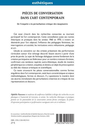 Cet essai s’inscrit dans les recherches consacrées au tournant participatif de l’art contemporain. Cette constellation puise ses racines théoriques et pratiques dans les années 1960 et 1970, à travers un désintérêt pour l’art objectal, l’influence des pédagogies féministes, les interrogations art-société, les intrications entre militantisme, pédagogie et art. L’étude se concentre sur des artistes présentant des performances s’articulant autour d’un échange discursif, faisant œuvre à partir d’une prise de parole. Le sujet de l’échange dialogique comme fondement de la création participative est fédérateur pour un nombre croissant d’artistes, confirmant une tendance repérée outre-Atlantique, étudié de manière périphérique (co-création, enquête), et devenu un objet de préoccupation au-delà des réseaux artistiques et scientifiques. Ce texte circonscrit les pièces conversationnelles comme formes singulières dans l’art contemporain, saisit leurs caractéristiques et enjeux méthodologiques, formes et discours. Il y questionne la manière dont ces œuvres introduisent des perturbations créatrices et critiques de nos représentations et discours.