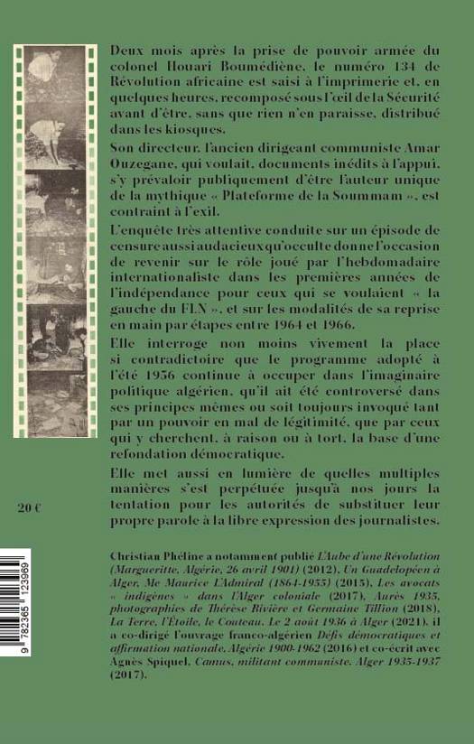 Deux mois après la prise de pouvoir armée du colonel Houari Boumédiène, le numéro 134 de Révolution africaine est saisi à l’imprimerie et, en quelques heures, recomposé sous l’oeil de la Sécurité avant d’être, sans que rien n’en paraisse, distribué dans les kiosques. Son directeur, l’ancien dirigeant communiste Amar Ouzegane, qui voulait, documents inédits à l’appui, s’y prévaloir publiquement d’être l’auteur unique de la mythique « Plateforme de la Soummam », est contraint à l’exil. L’enquête très attentive conduite sur un épisode de censure aussi audacieux qu’occulte donne l’occasion de revenir sur le rôle joué par l’hebdomadaire internationaliste dans les premières années de l’indépendance pour ceux qui se voulaient « la gauche du FLN », et sur les modalités de sa reprise en main par étapes entre 1964 et 1966. Elle interroge non moins vivement la place si contradictoire que le programme adopté à l’été 1956 continue à occuper dans l’imaginaire politique algérien, qu’il ait été controversé dans ses principes mêmes ou soit toujours invoqué tant par un pouvoir en mal de légitimité, que par ceux qui y cherchent, à raison ou à tort, la base d’une refondation démocratique. Elle met aussi en lumière de quelles multiples manières s’est perpétuée jusqu’à nos jours la tentation pour les autorités de substituer leur propre parole à la libre expression des journalistes. À ce titre, comme l’écrit Mohammed Harbi dans sa postface, la lecture de ce livre sera des plus féconde pour quiconque aspire à l’épanouissement d’une société ouverte à la pluralité des cultures, des idées et des croyances. Christian Phéline a notamment publié L'Aube d'une Révolution (Margueritte, Algérie, 26 avril 1901) (2012), Un Guadelopéen à Alger, Me Maurice L'Admiral (1864-1955) (2015), Les avocats « indigènes » dans l'Alger coloniale (2017), Aurès 1935, photographies de Thérèse Rivière et Germaine Tillion (2018), La Terre, l'Étoile, le Couteau. Le 2 août 1936 à Alger (2021). il a co-dirigé l'ouvrage franco-algérien Défis démocratiques et affirmation nationale, Algérie 1900-1962 (2016) et co-écrit avec Agnès Spiquel, Camus, militant communiste. Alger 1935-1937 (2017).