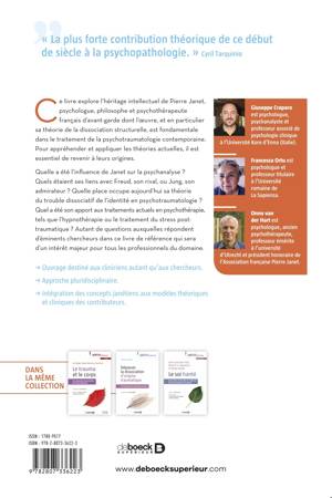 Quelle a été l’influence de Janet sur la psychanalyse ? Quels étaient ses liens avec Freud, son rival, ou Jung, son admirateur ? Quelle place occupe aujourd’hui sa théorie du trouble dissociatif de l’identité en psychotraumatologie ? Quel a été son apport aux traitements actuels en psychothérapie, tels que l’hypnothérapie ou le traitement du stress post-traumatique ? Autant de questions auxquelles répondent d’éminents chercheurs dans ce livre de référence qui sera d’un intérêt majeur pour tous professionnels du domaine.