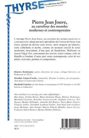 L’ouvrage Pierre Jean Jouve, au carrefour des mondes modernes et contemporains, dirigé par trois spécialistes de l’oeuvre de Pierre Jean Jouve, permet de dresser cette oeuvre, aussi suspecte qu’admirée, entre cathédrale et mythe, comme un moment crucial de notre modernité, descendant, d’une part, de Baudelaire, Mallarmé ou encore Edgar Poe, rencontrant des oeuvres soeurs comme celle de Bataille et fondant, d’autre part, notre contemporain, celui de nos poètes, écrivains, peintres et compositeurs.