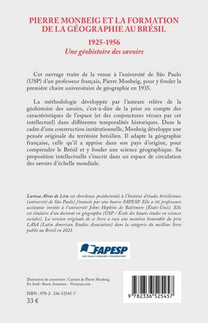 Cet ouvrage traite de la venue à l'université de São Paulo (USP) d'un professeur français, Pierre Monbeig, pour y fonder la première chaire universitaire de géographie en 1935. La méthodologie développée par l'auteure relève de la géohistoire des savoirs, c'est-à-dire de la prise en compte des caractéristiques de l'espace (et des conjonctures vécues par cet intellectuel) dans différentes temporalités historiques. Dans le cadre d'une construction institutionnelle, Monbeig développe une pensée originale du territoire brésilien. Il adapte la géographie française, celle qu'il a apprise dans son pays d'origine, pour comprendre le Brésil et y fonder une science géographique. Sa proposition intellectuelle s'inscrit dans un espace de circulation des savoirs d'échelle mondiale.